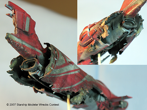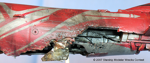 After the intricate paint job was complete, I used a pretty unconventional method to add even more texture to the damage. I carefully ran the flame from a mini-torch back and forth over the damaged areas - not to create an unrealistic melted look but to blister the paint and add subtle warping to these areas. The method could have destroyed the model but instead, it worked quite well.