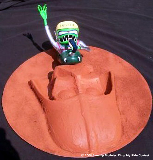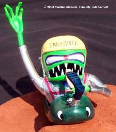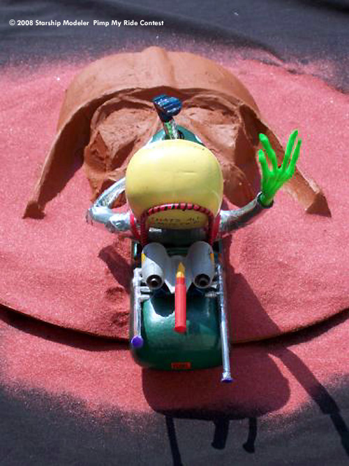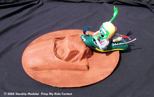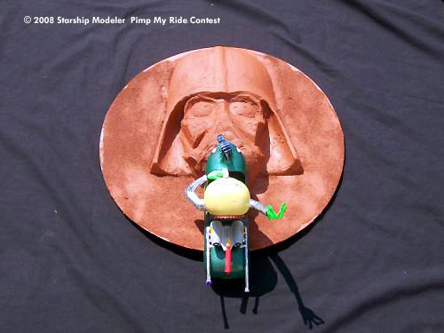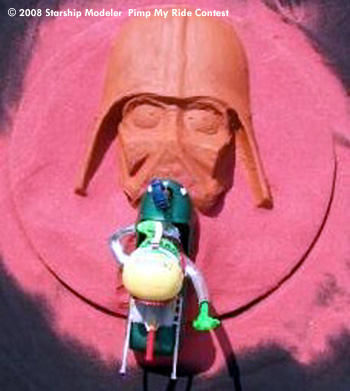 About the diorama: It consists largely of pity purchases from the clearance shelf at Wal-Mart. I passed Eddie month after month on my way to the pharmacy. I fondly remember the first incarnation of the Hawk Weird-Ohs (I built Freddy Flameout in 1963), so I finally relented and took the last one home. Vader's face is a child's mask bought three years ago from the bargain rack with an eye towards a Cydonian diorama. The base is a cardboard circle from a vegetable steamer package. When the contest called, the elements all just came together.