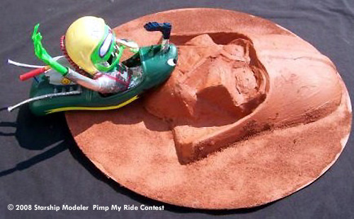The speeder was sprayed with Rustoleum Hammered Metal (don't go there!), great stuff that goes onto plastic without priming and gives a nice micrometeorite-pitted surface. The base was roughed in with spackle and model railroad grass before being sprayed with Rustoleum Terra Cotta accent paint. Eddie's helmet is Wal-Mart rattlecan yellow, and the details are done in various combinations of Testor and Tamiya acrylics. The engines were stolen from an A-10. The pressure suit is made of chrome duct tape, while the straps are colored chart or electrical tapes, a technique I dub cintage (rhymes with 'collage') for want of a better word. Decals are mostly stock.
