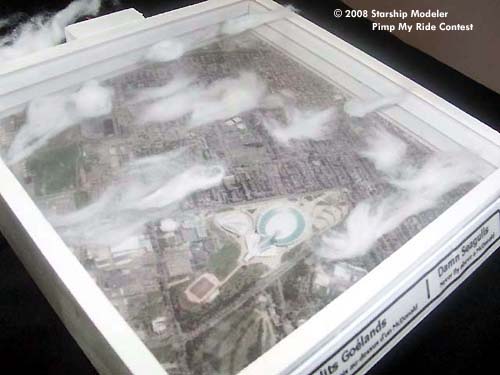 - The base is an aerial picture of Montreal with 3 layers of plexiglass with cotton puffs to simulate clouds at different altitude.