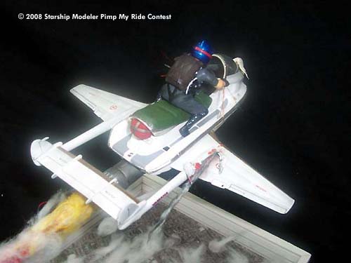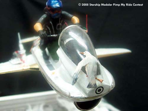 We are in 2012 and we just discovered antigravity. Finally I had what I need to complete my crazy project of flying above the clouds. I bought an old water racer and attached a pair of wings to it. For the propulsion I attached a jet engine under the belly. The antigravity is in the front to give the extra lift capacity. Everything went well on my first flight. Unfortunately I hit a couple of seagulls and I had to use my parachute to return to earth...