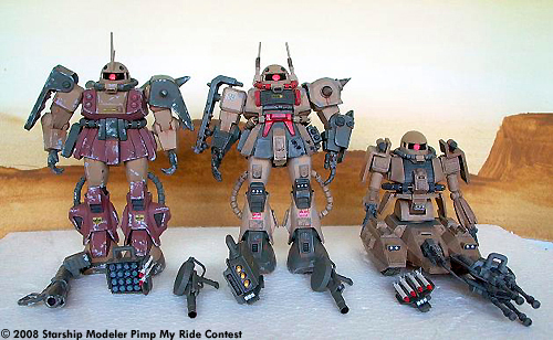 Desert Zaku MK-1: Upgraded with super-composite armor plates, new fusion-gear cooler, new armor pipes for booster, 280mm Anti-MS Grenade Launcher x 3, 185mm Grenade Launcher x 3, Armor-Shield with Magazine for Tank Grenades, 120mm Vulcan Machine Gun, 90mm Head-Machinegun