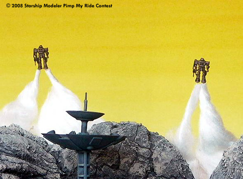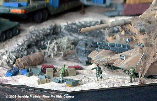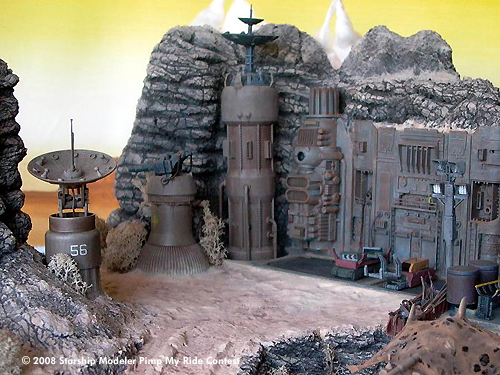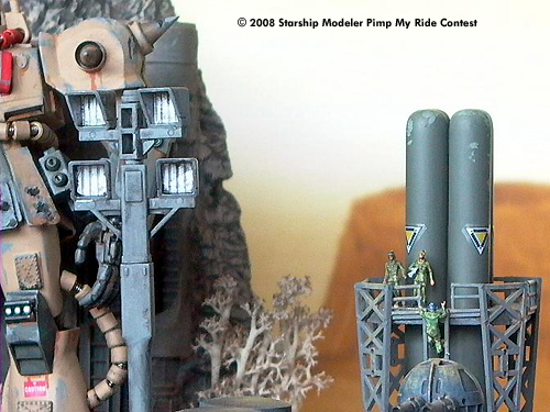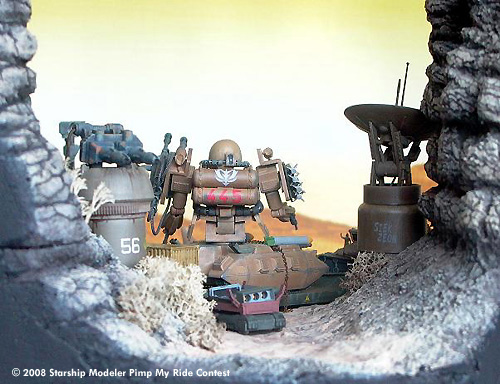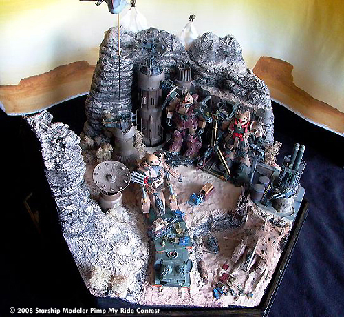 The Landscape and the Rocks are molded from Polystyrol-Foam and plaster on a wooden plate. The desert base itself is made from scratch, with parts taken from different kits and plastic bottles, upgrade units for model train stuff and some Option Kits from Kotobukiya.