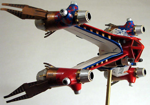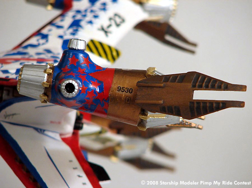 As the prototype craft earlier design features that changed with the SA-23 production model can be seen. Particularly of note is the visible surfaces of the recently developed Unobtainium alloy. Offering excellent strength to weight ratio for the high g maneuvers, it also possesses thermo-optical properties ideal for minimising absorption of heat from star and planets will maximising the rejection of waste heat from the engines. Improvement in engine technology minimised the need for this radiating area in the production models, allowing for the all over low-vis gray seen in production models. Also visible are the original weapons system which was eventually shown to be inadequate for requirements and replaced by the more capable version in the production model.
