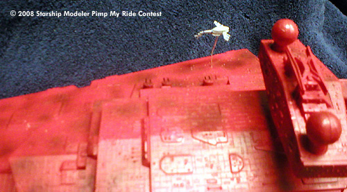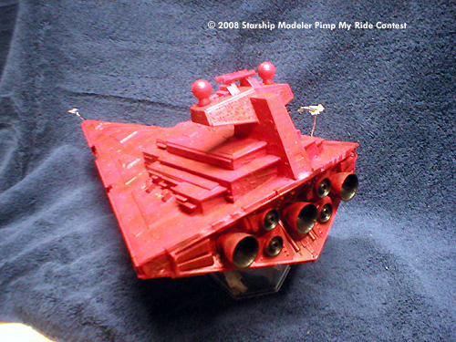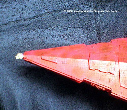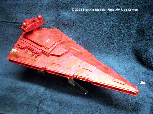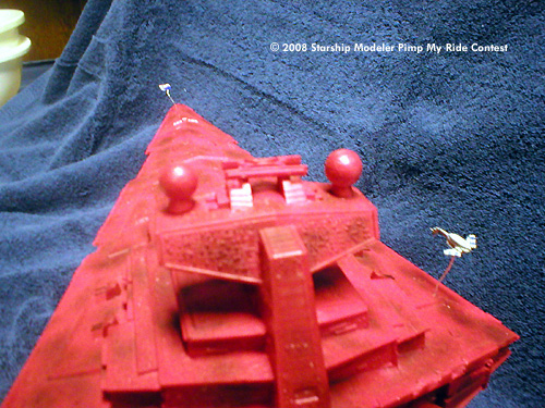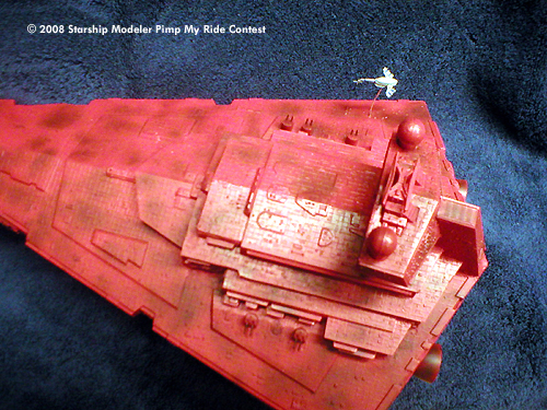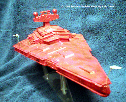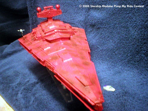 The Errant Venture was built as a mostly OOB Star Destroyer kit. A few slight modifications were made, most notably the addition of some guns cannibalized from a 1/700 New Jersey battleship kit and a bit of putty to fill in the most obvious gaps. She was then given a coating of bright red, but it still didn't look quite right to me. At almost every time I've read about the Venture, the ship is half falling apart, so I went ahead and weathered her up a bit. Even dirty, she is still one pimped up ride.