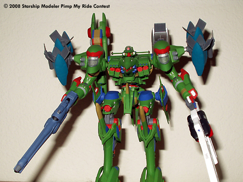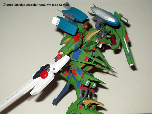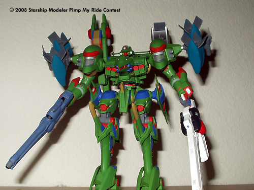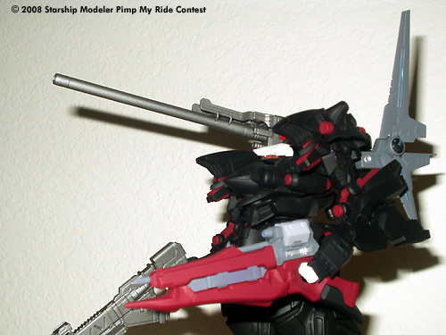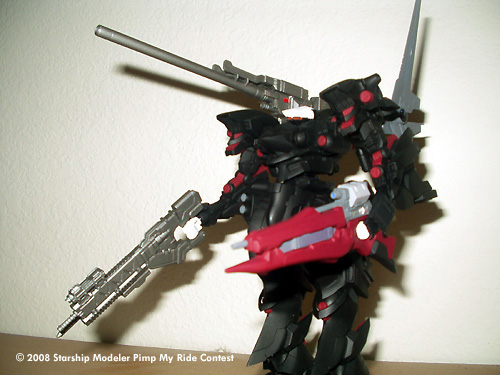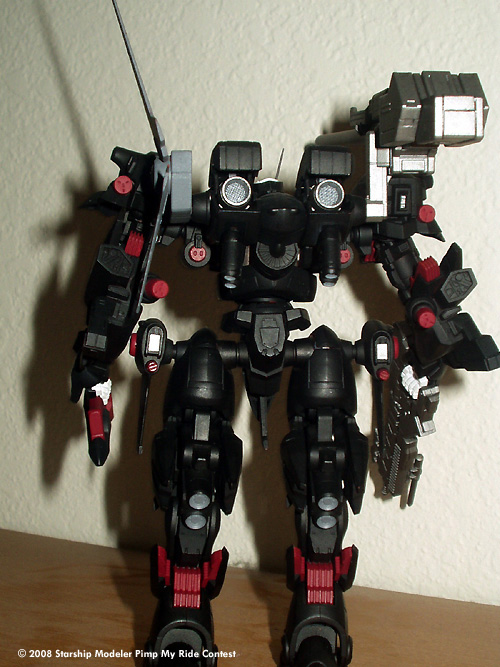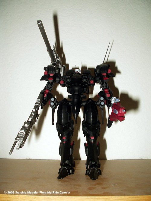 Comus has the more reserved color scheme: most of the machine is black with red details and white head and hands. I wanted the machine to suggest a grim reaper theme. Comus' weapons are painted in dull metallic shades.