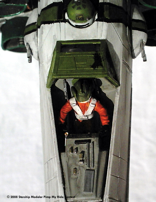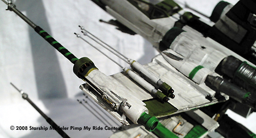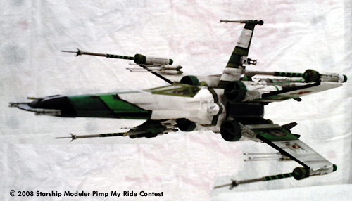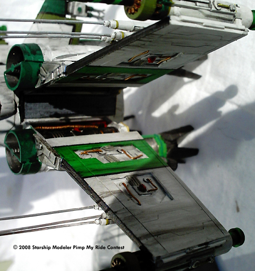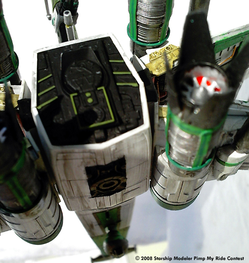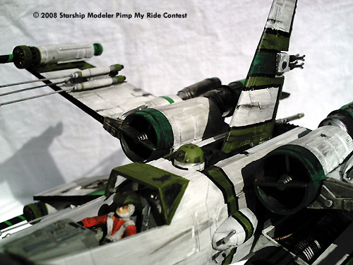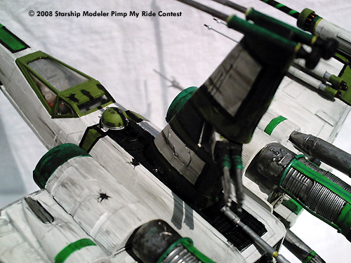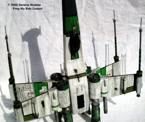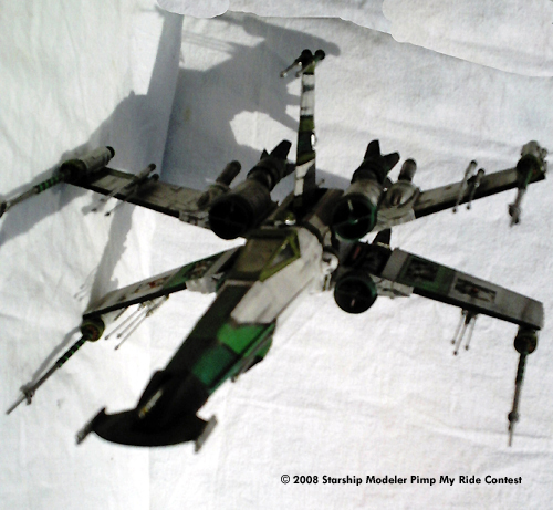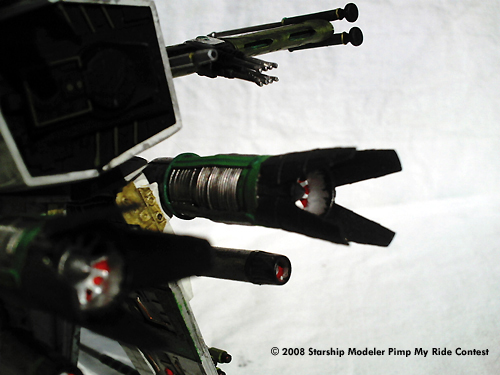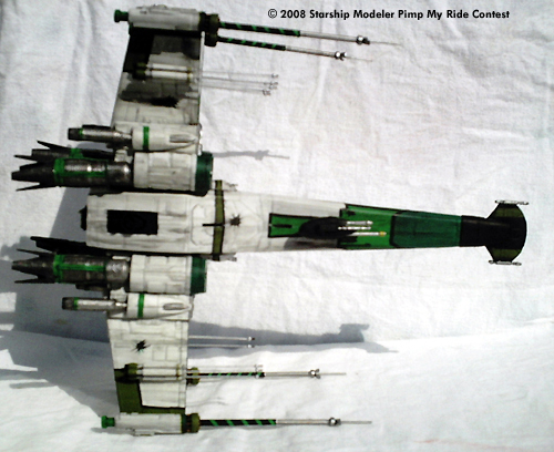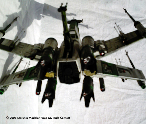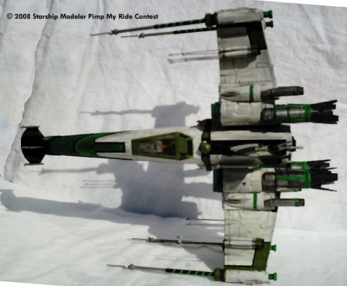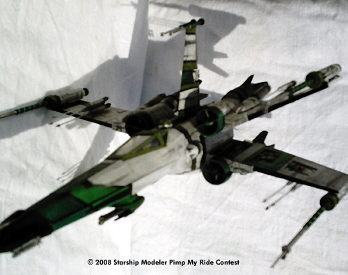 I got this partially built X-Wing off ebay for only a few bucks. With a few leftovers from a B-wing, Droid fighters, missile pods off some robot, space shuttle robot arms and a few scratch built items I created the Mean Green Machine. Many of the small guns came from the landing gear struts. Two Droid fighters sacrificed themselves for the small engine pods, the side gun pods and the nose canard. A Millennium Falcon gun gave the ship aft weapons to ward off pesky TIE fighters.