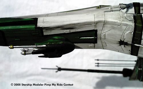 The amount of firepower was increased substantially, triple blaster units were placed on each wing (12 total), double gun pods were mounted near the main intakes (4 guns total), a nose mounted set of canards sported another 4 small blasters while an upper vertical wing was added that gave the ship two more forward firing lasers and four aft firing ones on a pivot base. A single heavy blaster was mounted in the nose and aft of the upper wing as an added bonus. In total there are 30 forward firing beam weapons, two torpedo launchers and five aft firing beams.
