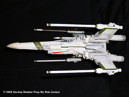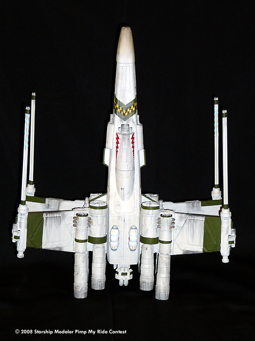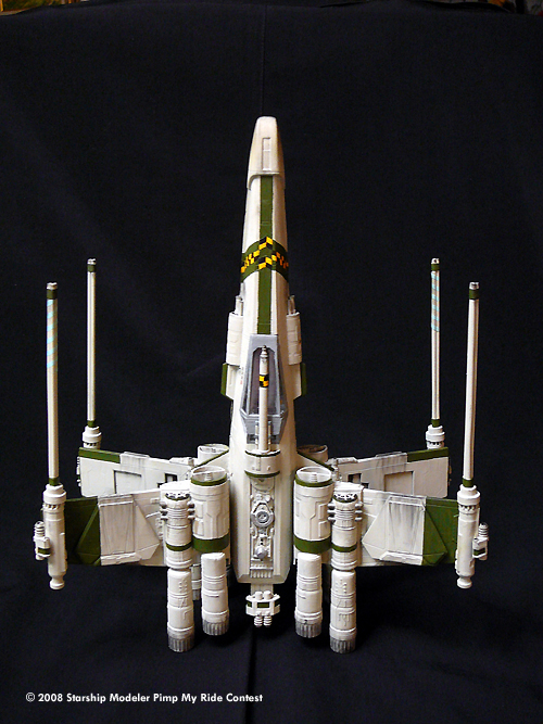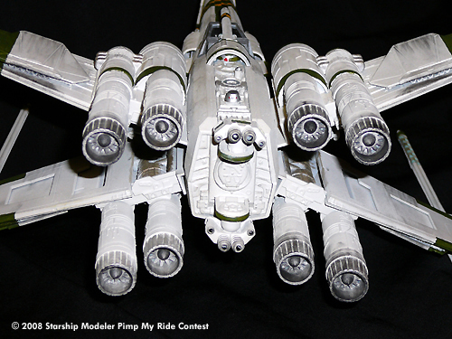To provide superior firepower, they changed out the standard wing cannons with heavy triple blasters and a side mounted pulse cannon. Twin blasters were added over the additional proton torpedo magazines on both sides of the nose. Two blasters were added also mounted to the new retractable wings in between the S-foils. Twenty-eight (seven per wing) concussion missile tubes were mounted under armor plates on the wings. An experimental heavy rail gun was incorporated into the fuselage below the cockpit with a single ion cannon mounted to the droid cover in the unlikely event that they needed an intact enemy fighter. Upper and lower independent dual pulse cannons were also added to the back of the X-Wings to prevent “trench runs with Vader”. The lower fuselage was also reinforced to carry optional weapons payloads (i.e. the seismic charges shown) to suit different mission needs. Finally an additional four engines were mounted to each wing to help power the additional weapons and to keep the fighter moving at an acceptable combat speed.