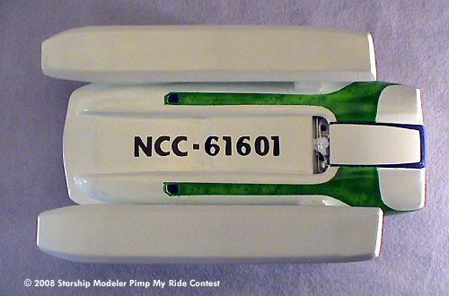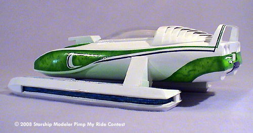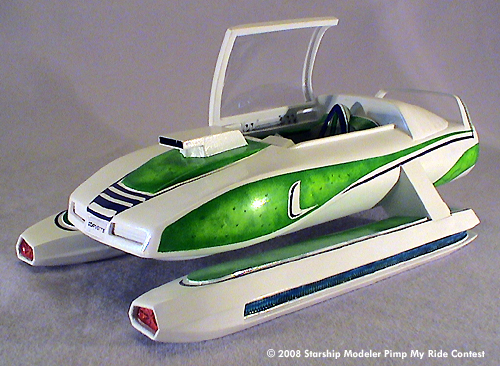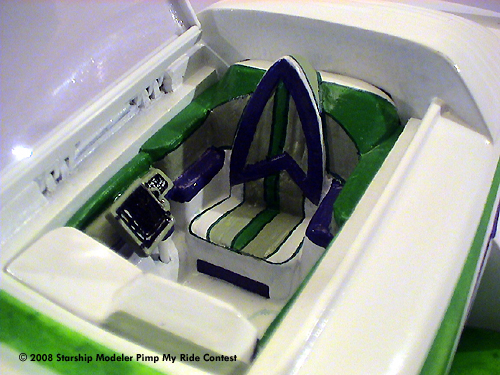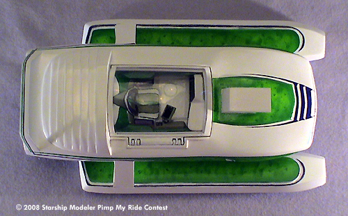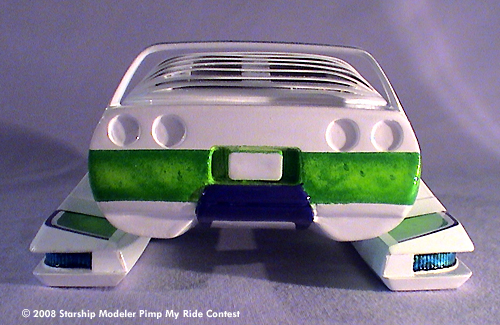 I pulled out my original interior attempt due to the need of something more… Trekish. The basic interior “tub”, the tail fin, and the snorkel hood scoop are from the grebblie box. The seat back was sculpted from the blessed Aves, which I also used to finish in the wheel openings. I also added some Aves to the back end so that the center of gravity would be centered over the nacelle mounts.