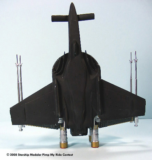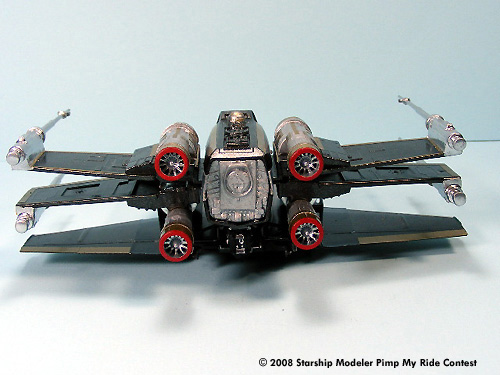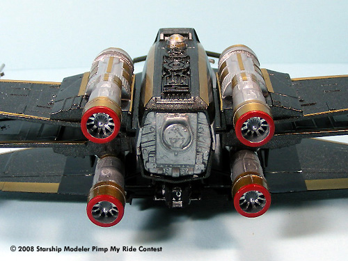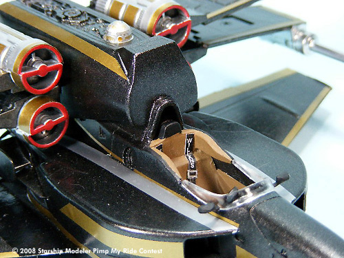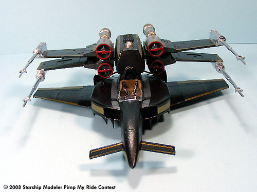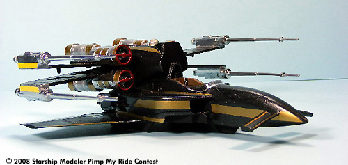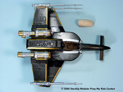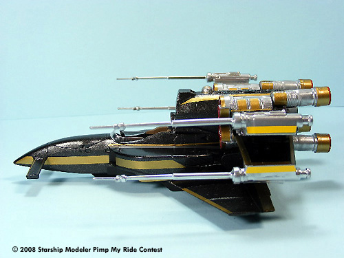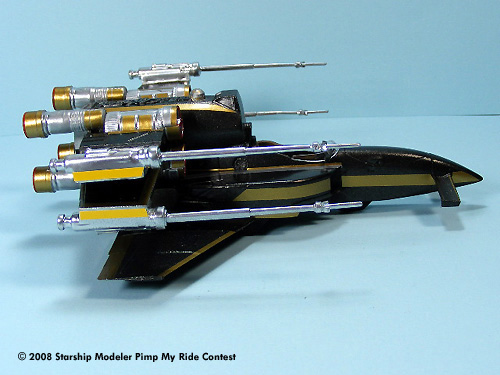 The model body and wings were spray painted with Black Night Metallic and the engines and laser cannons were painted with Metallic Chrome. Hand painted acrylics were used for the cockpit. Gold and Silver colored Pactra Trim Tape was applied as the bling bling decoration.