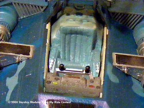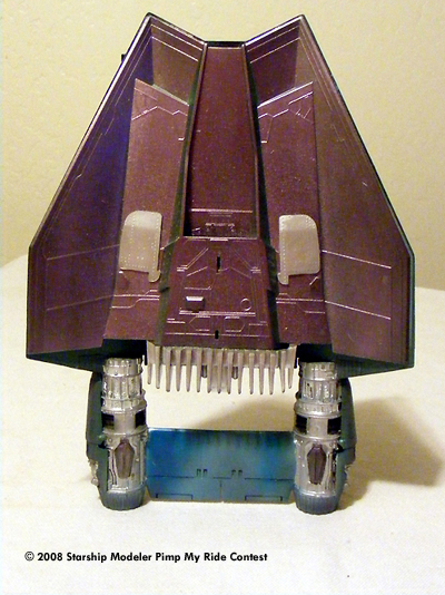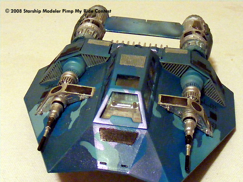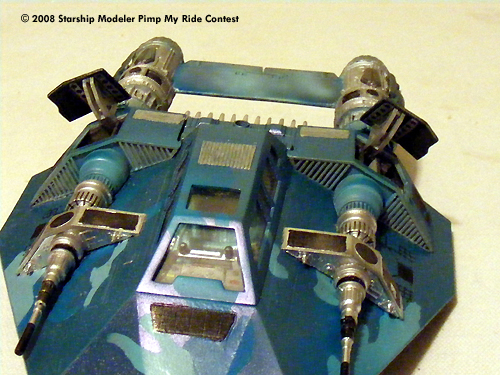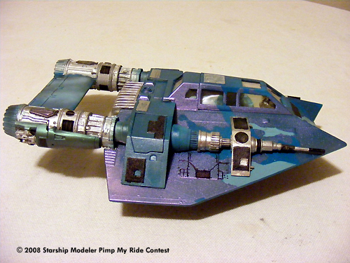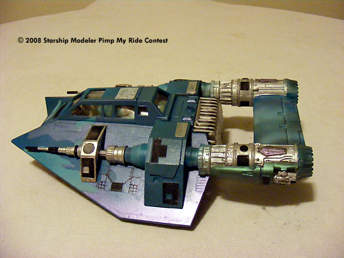 I used a pair of engines from the Ankin pod racer. I set it up with a sound system for the young man using Aves putty and the seat and controls from a sea quest salvage using custom color paints I set up a "hip" cammo paint job. I cut out the stencils by hand using grid paper to design the pattern.