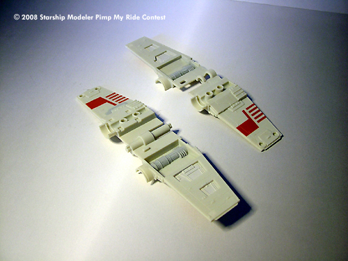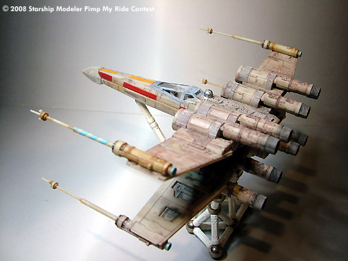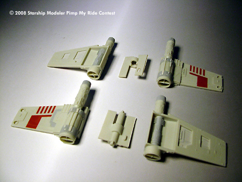 The wings were cut off on the first model, while the pivoting mechanism was cut off on the second unit. Carefully gluing the parts together resulted in the double engine on each wing. The original paint job was toned down using alcohol, then alcohol-acrylic paint solution was used to weather the model. Cotton swab dipped in alcohol was used to remove extra weathering paint.