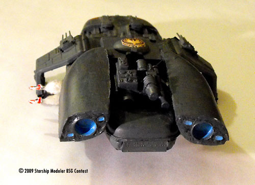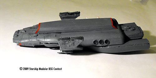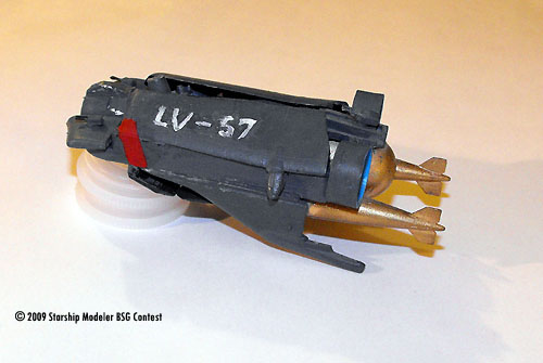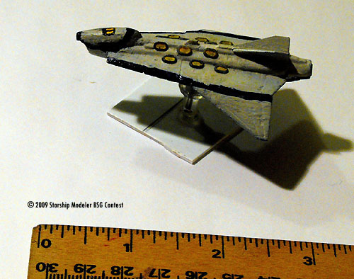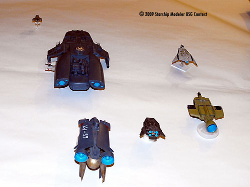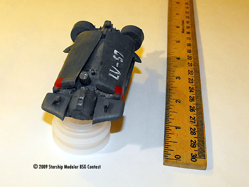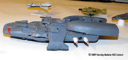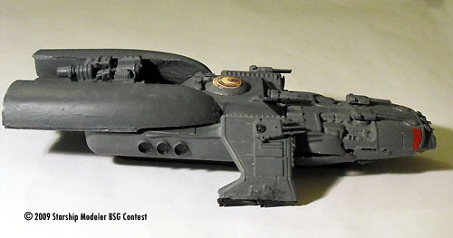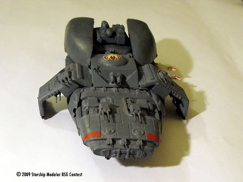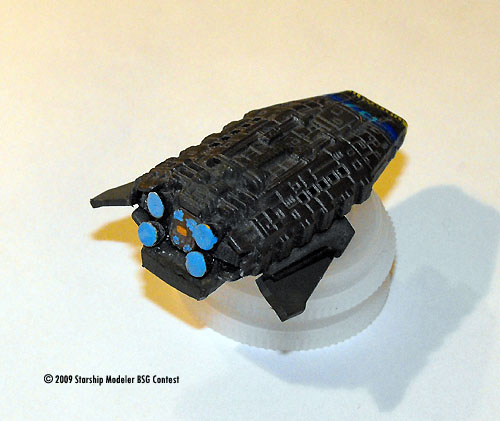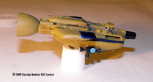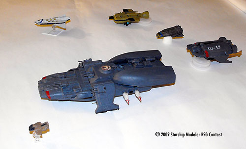 The bow of the ship and extending wings are from a Star Trek Runabout Science Pod, (actually the initial inspiration for the build, I thought it looked Battlestar-y.) The central hull is comprised of a dme light from a car, and parts of a Lunar Lander module. The engines are parts of a Russian submarine hull, and in between the engines are a post-it note holder, and the backpack of a stormtrooper action figure. The ventral hangar bay is part of a battleship hull. Various rockets and ship turrets also included.