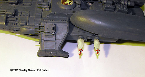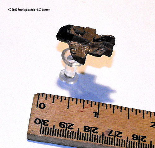 I wanted to make a refueling and supply vessel of some sort, and it just kind of flew together in a few nights of frenzied building. The parts I remember adding were as follows: A-10 Warthog wings and tail (Smaller scale,) Engine fans (larger scale) Engine cowling from a prop plane, several fins from a Russian submarine, a plastic strap buckle, a Co2 Canister, two drop tanks from a jet fighter, various turrets and other greeblies.