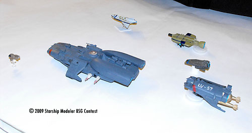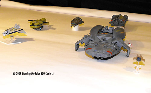 Made using a small SAAB Draken model, some lifeboats and rafts from a battleship, and missile fins, this was an easy and fun bash into a smaller and lighter transport vessel than the famous Colonial Heavy 798 (soon to be Colonial One)