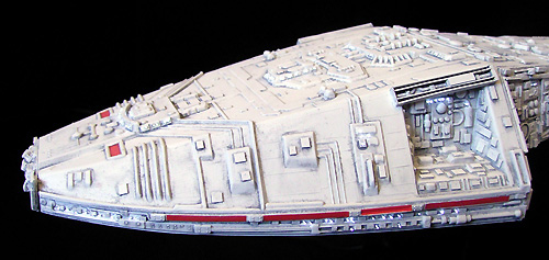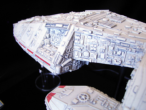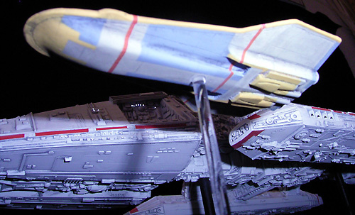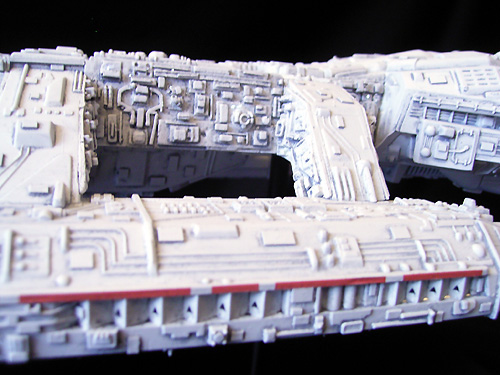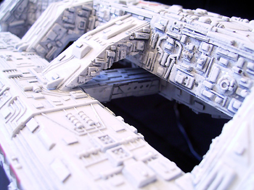 detail set from SMT to increase the overall level of detail of the model. The details on the resin panels in this set don't look like the details on the filming model but I think they are a very good choice. Applying the panels to the model was not easy. Some specific modifications on the kit were necessary before the resin parts could take their place. In addition I added dozens and dozens of small plastic sheets all over the model. I also used greeblies and parts from my spare part to upgrade some poor detailed areas: have a look at the front and the sides of the hangar parts. Some new details are scratchbuilt from very tiny bits and ends like the parts on the Galactica`s “cheeks”.