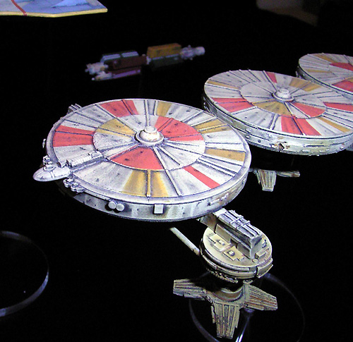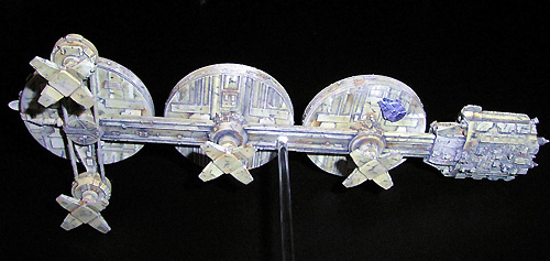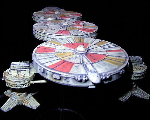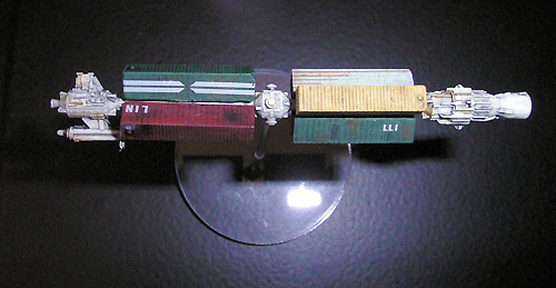 This is the largest ship of my private Rag Tag Fleet. It took the longest time and the most work to finish. But it was also the most fun to built cause this is a mining ship that is allowed to look dirty and used. First I mixed three different sand tones based on Revell sand no. 16 and 17. The light sand was used for an overall primer of the model; the darker sand tones were used for the ships underside and recess areas. The masking work for the colored segments on the upper disks was made with Revell masking film. Revell yellow no. 15 was chosen for the yellow segments, Revell orange no. 30 with a few drops Revell red no. 36 was my choice for the orange segments. These colors were sprayed in some layers with airbrush. Some pictures of the studio model helped me to match the correct position of the colored areas. After few days of drying I coated the whole model in a good broth of thinned black oil color and cleaned the model more carefully. This ship furthermore has the most rusty areas of all - created with thinned sienna oil color as usual. Artistic black chalk was used to create a smutty overall surface. To make those awesome looking streaks on the disks upper side I used a “rubber-pencil” and erased some of the black-wash-layer by toggling outer to inner diameter - one of my favourite effects! With black chalk I draw some spots on the disks upper side and smudged them to the outer diameter with my fingertip - another amazing effect. Some layers of dull coat are recommended to protect the “chalky artwork”. I know this model maybe looks too beat up but this livery ship just came from a long mining mission on a really grungy and dusty asteroid with acid slops and meteoric showers. Cargo bays filled with Tyllium is the fee for this hard operation.