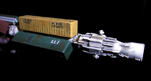 The challenge on this model was mixing the color shades for the six containers. I didn't have the time to get the Polly Scale Colors recommended in the instruction sheet. So I try my best mixing my Revell and Citadel Colors and match the color shades as close as possible. All containers got a wash with thinned black and some rusty and dirty areas with sienna. A wash with thinned black and some rusty areas with thinned sienna painted the main structure of this galactic mover with Revell white no. 301 followed. The decals for this kit are very small but no problem for the experienced modeller. A coating with Testors dull coat completed the work on this model.