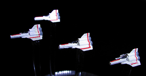 These four tiny Viper starfighters are not in scale with the rest of the ships. I've been told they are in scale with the Galactica studio model. Anyhow I wanted them on my diorama - I could not resist - they are soooo cute! Each Viper is painted with a drop of Citadel Skull White. The red markings were done with thin decals I found in my leftover decal collection. The cockpit and the thrusters are painted with a small brush.