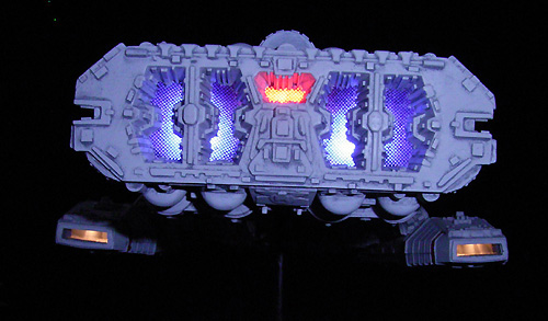 When all additional detailing was done I prepared installing the lightning. Comparing screenshots of the Galactica I started to drill small holes on the side sections of the model. For the head-section of the model I added more windows than you can see in the movie-model. I liked the idea that there is more life going on with many lit windows on a huge starship like this - maybe it is Adama`s Birthday. Each hole is fed with a 0,2mm fibre optic. Illuminating the engine was made with 2 diffuse blue and 1 diffuse red LEDs. The fence structure in the engine looks very nice and was made from parts of cooking accessories - splashguard for pans. The scratchbuilt hangars have lights as well. Installing all the lightning and cables was lot of work but easy to do. And the effect is brilliant!