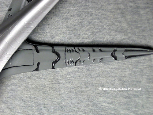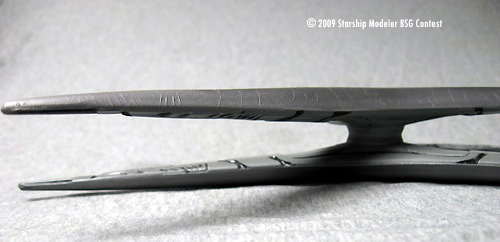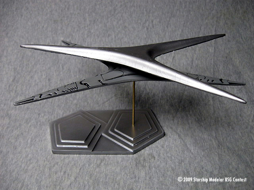 I really liked the design of the Cylon Basestar from the new Galactica. When I bought my Galactica I also bought Replicas Unlimited Cylon Basestar. Both kits are in the same scale. If not the easiest this is certainly one of the easiest kits to build. The kit consists of two identical "stars" that are glued together 90 degrees from one another. I filled the seam around the circular hub and that was it. I painted the top and bottom and the base with Alclad II Aluminum. The insides were painted with Aircraft Gray. The model was gloss coated and the insides were washed with an oil wash. This was a very simple project that looks good on the shelf with the Galactica.
