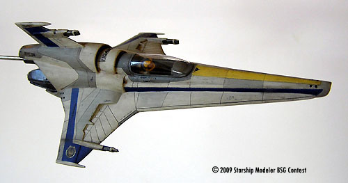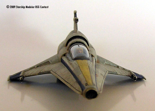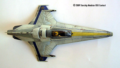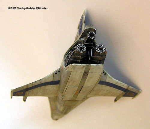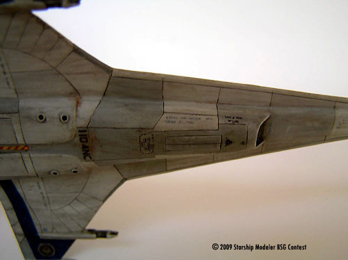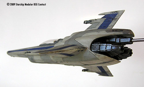 As you can see I don't care for series continuity or screen accuracy as I used decals as I liked, representing a ship from the Battlestar Rycon (I liked the name) bearing markings from the Galactica (I liked the design), but hey, it's science fiction - everything is possible. The paint design is my own and I added a lot of "inscriptions" from a 1:72 Verlinden aircraft transfer sheet to give it a more realistic look.