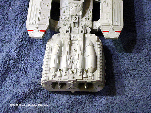 This is the Timeslip Galactica model, made into the Battlestar Columbia. The model went together well. There were a few rough spots, but overall this is the prettiest resin model I've seen, and the casting was quite nice despite being such a detailed subject. The model went together quite easily with no real problems. Slow curing gel superglue was used for joining the major components. Some on the SSM message board commented that a heavier duty adhesive like two part epoxy would be better, but the superglue worked fine - just be sure to throughly coat the contact points and give the parts plenty of time to dry. I gave the major assemblies a day apiece to cure, and there have been absolutely no problems.