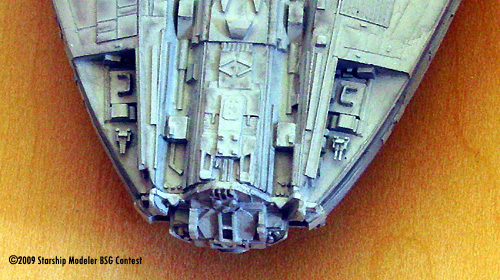1/700 Imperial Japanese Navy guns from Fujimi were added along the centerlines, dorsal and ventral, within the chin cutouts, and along the landing bays. I tried to figure out the most logical locations for main battery turrets, the prerequisite being good fields of fire; ships don't need turrets literally everywhere if the ones they have can fire in many directions. The intent was to show some visible armament, but not make the ship into an overarmed Death Star. I view battlestars as possessing layered weapons systems, from laser turrets to Vipers to anti-ship missiles, which are represented by the photoetched grills atop the center section; they're actually chaff and flare dispensers from an unused 1/48th aircraft PE fret. I added a lot of photoetched details, mainly cockpit pieces from PE sets in the spares bin.