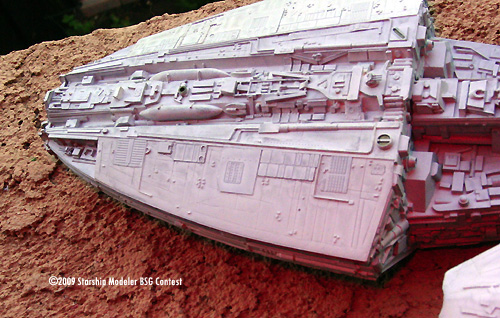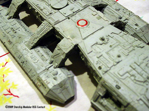 Basically, if a large flat raised area was unadorned then it probably got something added on or near it to supply some visual interest. The head ventral section came in for special treatment to give it a more plated or armored look. Various plastic vents, grilles, and domes were also added. Where some details were damaged they were repaired, replaced with greeblies or plated over with photoetch or plastic sheet. The base color is Testors Acryl Light Grey, while the red highlights are Floquil Coast Guard Red enamel. Various Acryl black washes were used to bring out details. The red circle atop the dorsal dome is from the JT Graphics battlestar decal set as I ruined the Timeslip decal. I didn't paint the red highlights on the front of the landing bays simply because I thought it looked better plain.