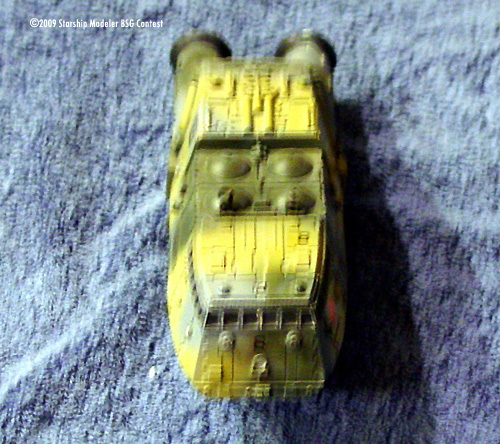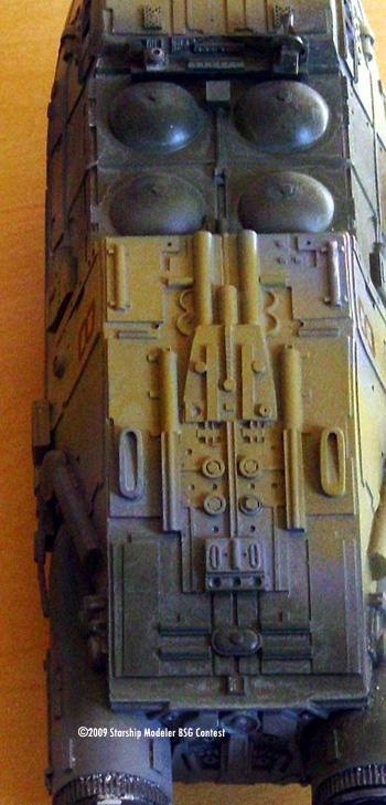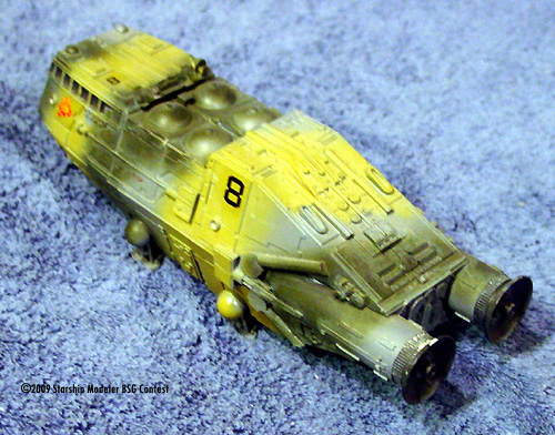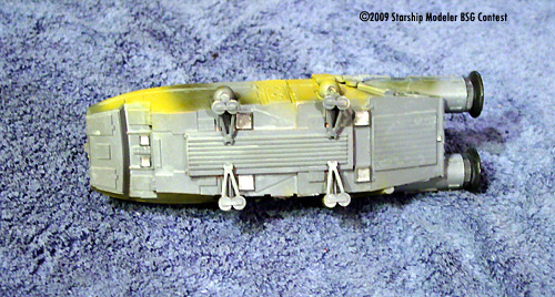 This is the Alliance Original Series Colonial Shuttle, purchased from Federation Models. I wanted to do something different, so she received a nice camouflage scheme, as if she was actually in service as an assault transport. The paints are various shades from the Testors enamel and acrylics line. Weathering was done with a number of light grey washes to really dirty up the previously clean paint job - remember, this is a hard working combat shuttle, not a hangar queen. The boar's head nose art came from a Monogram F-8 Crusader VF-11 decal sheet; I have forgotten where the numbering came from. There are many extra vents and thruster ports added here and there, including vertical thruster ports on the shuttle's ventral side so that the thing could actually take off in real life. I must admit to being bothered by there only being those two big engine bells in the back and nothing else. These are Wave detail parts bought from 'Da Store. The shuttle does not sit perfectly straight, as the landing gear was tough to make consistent lengths all the way around. There is a slight lean to it, I must regrettably admit.