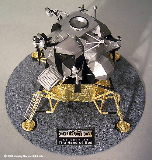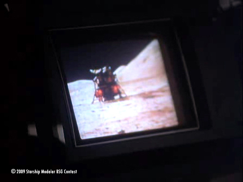 When the BSG contest was started I thought “which model could I build that, probably, no one else will do?”. I zapped through the classic episodes, searching for something outside the main subjects, and indeed I found an interesting one: The very last scene, even the very last screenframe in the very last episode of the old series (#24, “The Hand of God”) shows the lunar lander “Eagle” on a viewscreen of an old astronomical room on top of the Galactica!