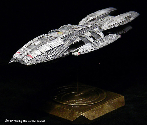This is a model of the Battlestar Galactica from the Sci-Fi Channel series of the same name. This little gem of a kit is mastered by Coby Lorang and produced by Alliance models. My copy of the kit was purchased from Federation Models. It finishes at 6-3/4" long.