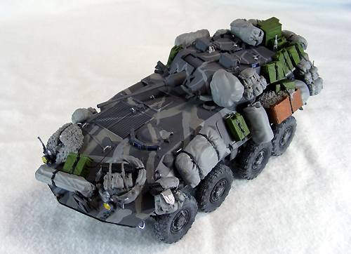 The Urban Camouflage scheme was hand painted using Acrylics. Gunship Grey is the hull base color with Dark Ghost Grey and Neutral Grey accents. The tires were weathered using a combination of three pastel chalk pencils. The stowage parts were hand painted with acrylics also.