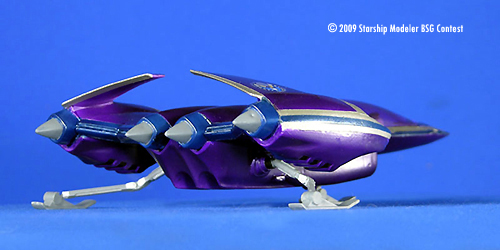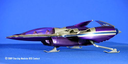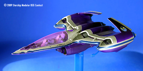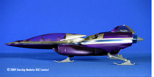 The characters of Battlestar Galactica went through a lot (understatement), and l read that stuff blows up and people die in the last episodes of the current series. So I kit-bashed this jet for Starbuck and wrote as good an ending as I think she could have. This kitbash is based on an AOI OGRE AN-21 race car by Aoshima. The original design looks like a jet with racing tires. My aim was to change the single-seat 1/24th scale racer into a two-seat 1/72nd scale jet.