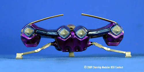 I like to design my own insignia but light ink-jet colors printed on transparent decal sheets do not come through strongly enough on dark models. So I used decals from a Warhammer Grav Tank. I'm not gloss-coating the model yet. I still hope to print satisfactory decals of my own design somehow.