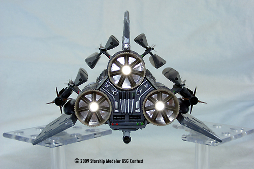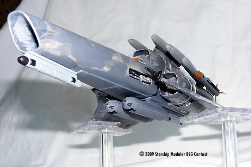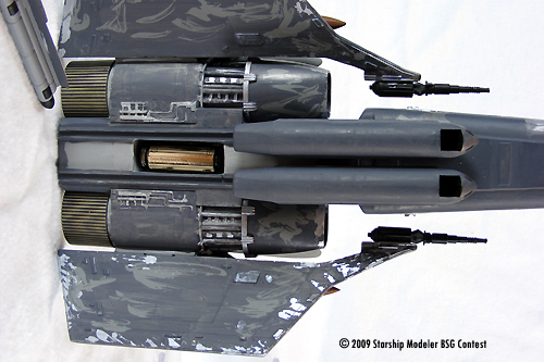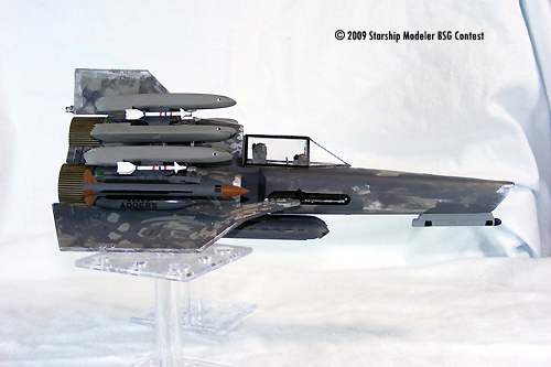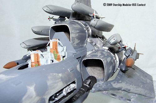 The nacelle mounted weapons are a mixed bag, all mounted on 1/72 pylons from a F/A- 18. The Shark missiles are 1/72 scale Tomahawks from the Revell B-2 Stealth Bomber (the giant boomerang-shaped one). The Gnats are 1/72 Sidewinders, and the Dragonflies are 1/48 scale HARM missiles.