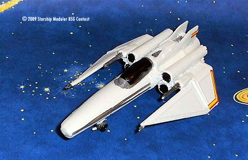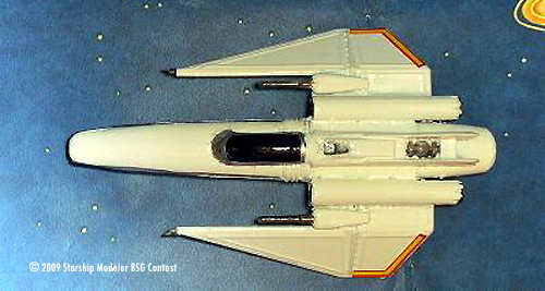 The model was made from various items collected along the way, purely because of their “spaceship” potential. These include a highlighter, felt pen caps, and undercarriage from a plane model. Other parts of other models found their way into my gubbins box, and were used for the tail fins, blaster cannons and the wings (yes, there are from a small snap-fit Tie Fighter). Card and putty were used to fill out recesses and gaps. The scale is in the region of 1:72.