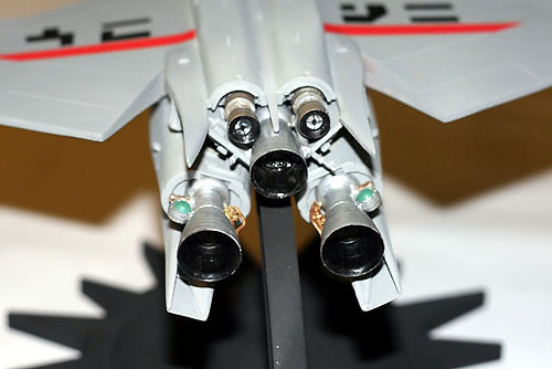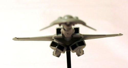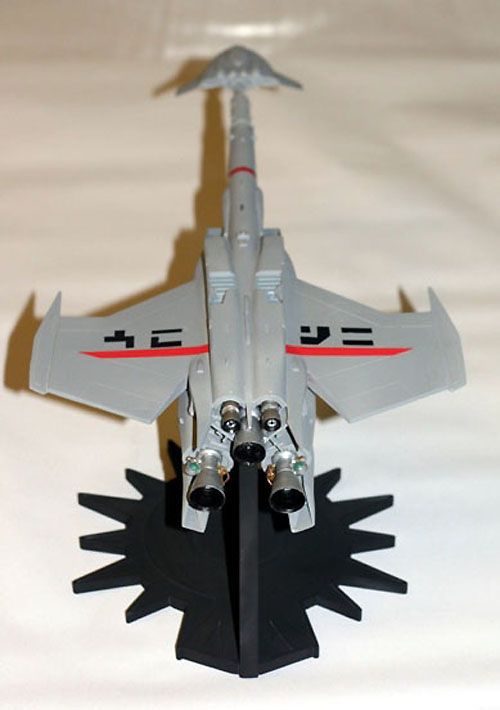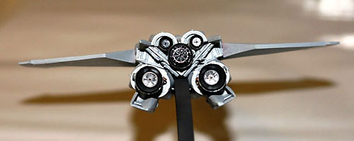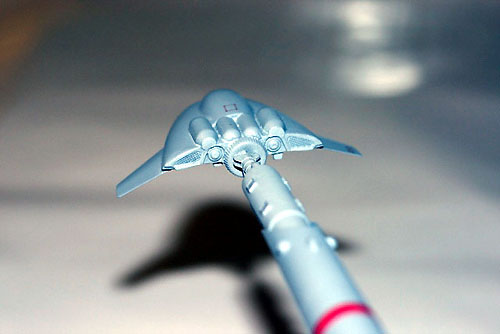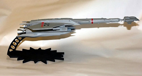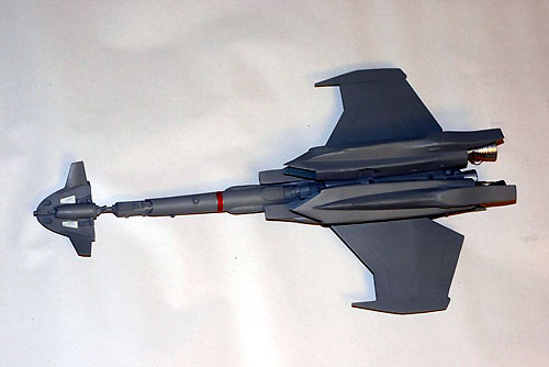 When I was in high school I thought this was the coolest ship ever- except for maybe the DY-100. Even though it was only on screen for a few seconds it left a lasting impression. When I had some time, ambition, and three Airfix 1/72 F-15s all at the same time, I started cutting and pasting. The ventral intakes are two sectioned F-15 intakes and adjacent bodywork spliced together with putty and scrap plastic. The fuselage is mainly the third F-15, upside down, with the neck lengthened with an old rocket half that matched the F-15 taper and part of a cheap plastic corkscrew. I was fresh out of Saturn V engines, so cobbled some together from beads, 1/200 SSMEs, the nosecone of one of the F-15s and other spare parts. The wings are built from plastic sheet and based on a 3-view of the Buck Rogers Starfighter I found on the web. The command pod/lifeboat/whatever it is was a real stumbling block for me. It looked so darn familiar, but after several attemps it still did not look right. Then I looked at the the Roomba's remote control. I chopped off the end, added a few bombs and drop tanks and there you are.