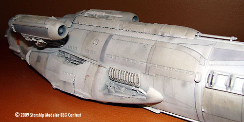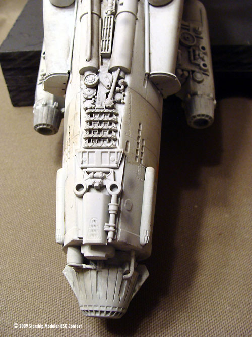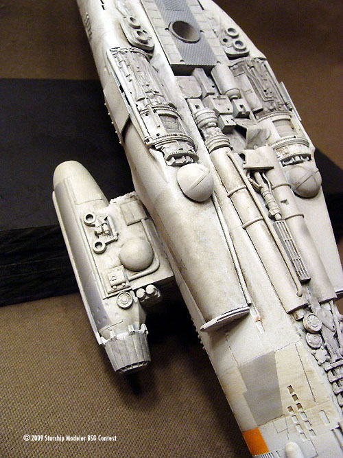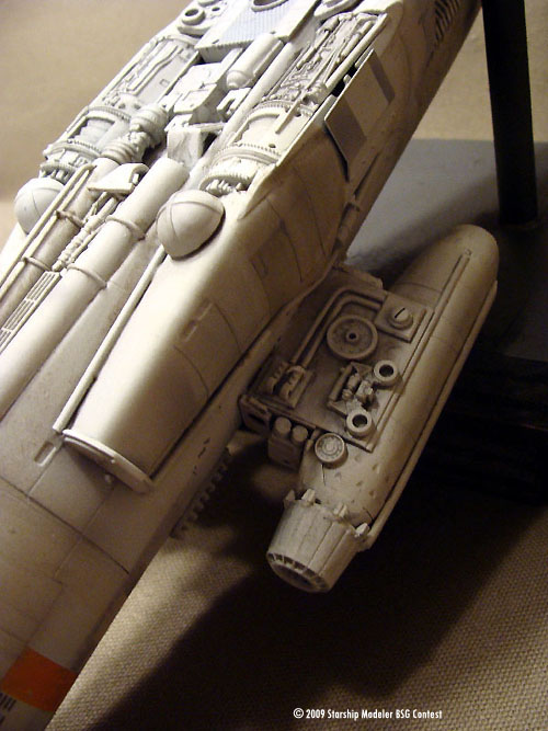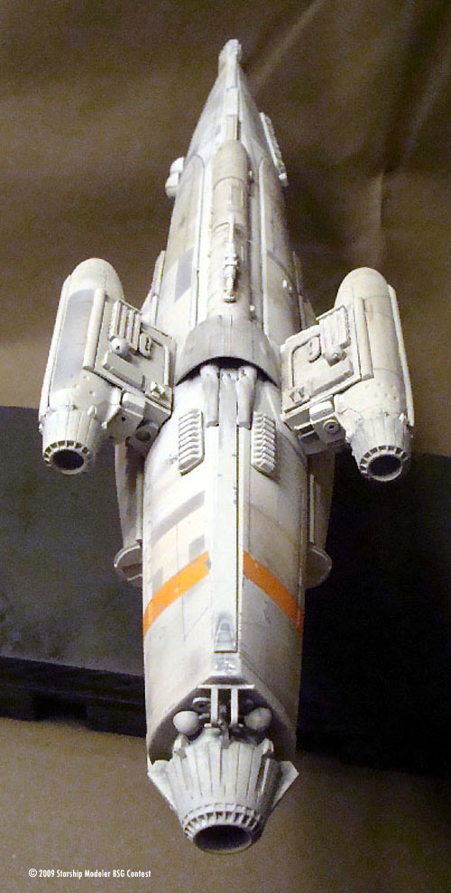 Since the show first aired back in the 70's, I was hooked. When the re-imagined show aired, I was so happy to see the original rag-tag fleet make an appearance. I have always wanted to build my own ships of that fleet. This is my first completed one. The idea came from a German submarine model that was ridiculously cheap. From there I just let my imagination run. I did not use any kind of plan, just put on the model what I thought would look best, hoping it would all work out. As far was what parts...that is a good guess. It is a German submarine, a German ME109, some Babylon 5 Starfury parts, Star Wars models (Anakin's Pod Racer for sure), various Tamiya kits that were left over from other projects.