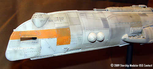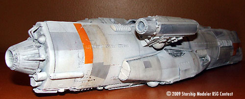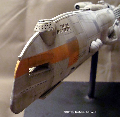 I initially painted the whole ship in Floquil Concrete. It was too warm for me, so I began to mix a little Reefer White into the Concrete and wound up with a base coat I was happy with. I then began to add grays and browns into the mix and painted areas of the ship. I did not want too much of a contrast, but I wanted various shades in the hull. The orange striping was done a bit on the light side as I wanted the panels and color variations to show through. The weathering was all done with washes and pastels. Teh panel lines were drawn in with pencil. The initial idea behind the paint job was that this ship used to be a passenger/luxury liner. It is an older model and has been replaced many times. It now serves as a freighter, moving goods and people through the less popular places of the colonies. That was until the Cylon attack. We all know what happened after that!