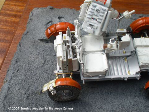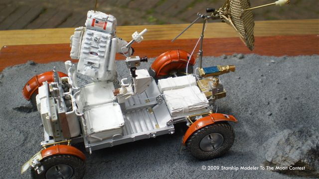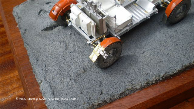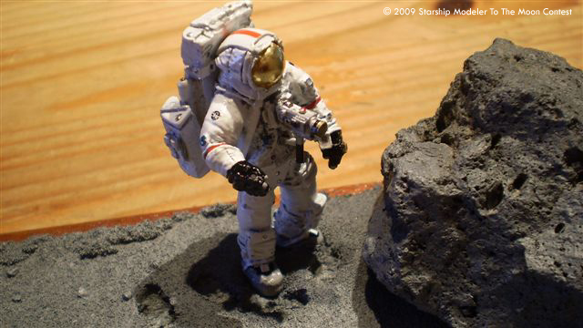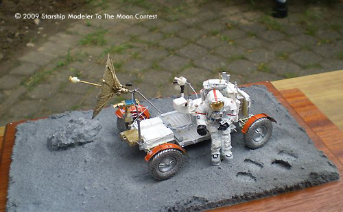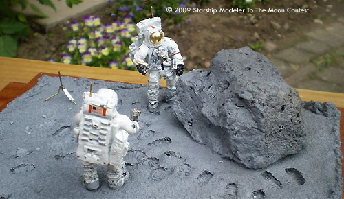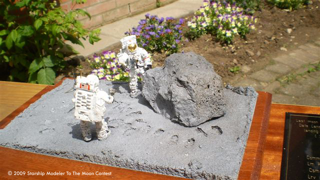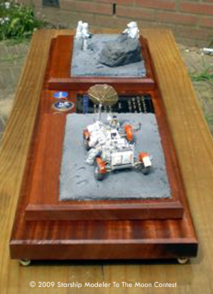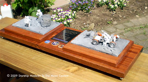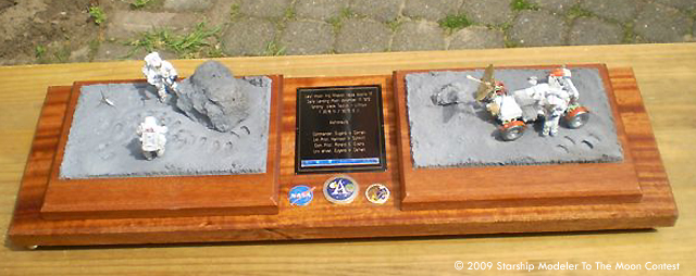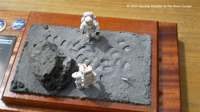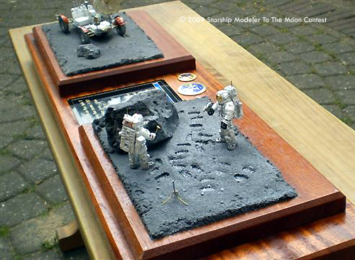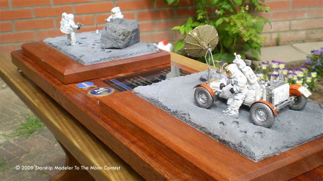 This diorama was built in 600 hours. There are several additional materials used. The basic kit is from EVA models, the most material are resin and photo-etched brass parts. It is not easy to build as a lot of parts are almost too small to hold with your fingers. The astronaut visors have real 24-karat gold leaf and the space suits have a lot of added details.