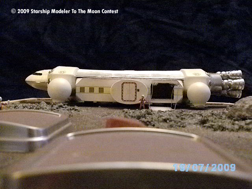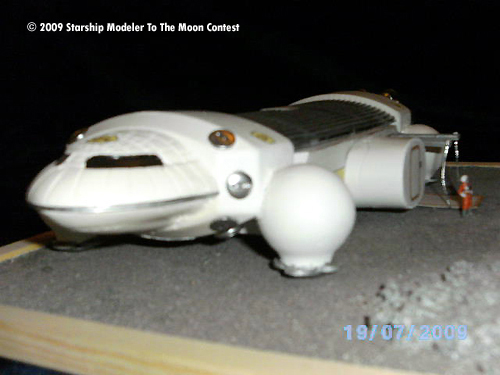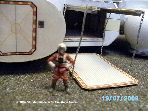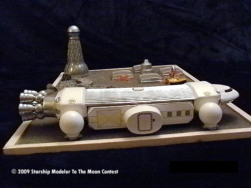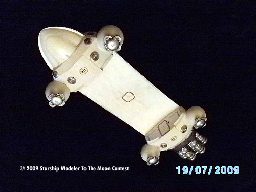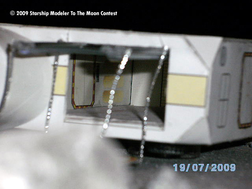 The “Transporter Pod” is made from card, cardboard and paper. I also created an interior for the cargo area (in a PC graphics program), as it could be seen through the open payload door. To allow the Moon Buggy to enter and exit the Pod, it has a simple lift mechanism, where a platform can be winched out from the Pod and lowered to the surface. The “chains” for the lift are made from small sections of metallised thread. The lateral docking ports are made from shower gel bottle caps, with details designed and printed from a PC graphics program.