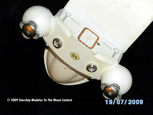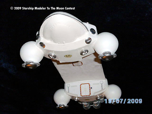 The engines are from a “SpaceCruiser 1” model that had an unfortunate accident. They were altered to improve the profile and fit, and wooden beads were added to recreate the overall look of the original Eagle engines. Small model wheels were used to make the end-caps for the engine bells.