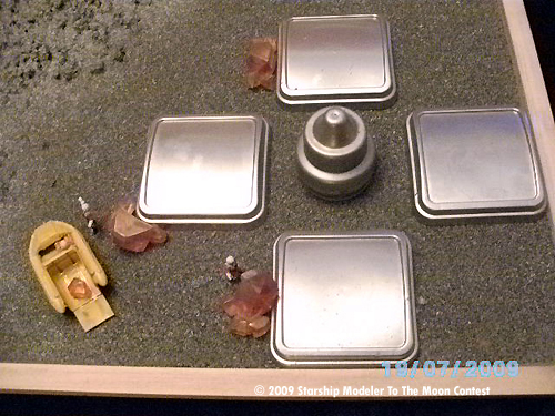 The Moon Buggy is made from a small plastic toy “dingy” that was attached to the top of a scale die-cast 4x4 car. The dingy was cut into 2, lengthwise, and widened using card, and then a cargo area was made using more card and silver coloured edging strips from a local craft store. The same kind of wheels that were used as the Eagle engine bell caps were used to make the six wheels for the buggy, although the made to be made thinner using a scalpel-type craft knife. The aim was to make a vehicle that was similar to the original but with some updated elements in the design.