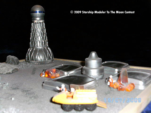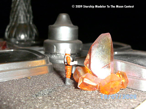 The crewmen are depicted using Rebel Pilots from the Micromachines Star Wars series, with the stands removed. They were already in orange suits, which made life a little easier for me. All I had to do was customise the helmets, using model paint, to turn them into proper spacesuit helmets. The exception was the crewman seated in the Moon Buggy. He is from a Zoids toy and was originally plain blue. I had to paint him orange and add other paint details by hand, so that he looked similar to his colleagues.