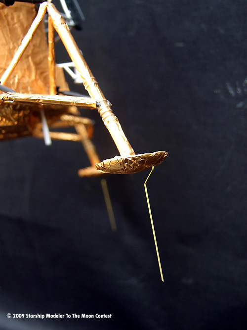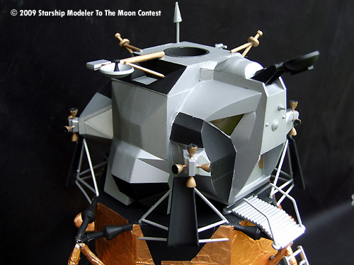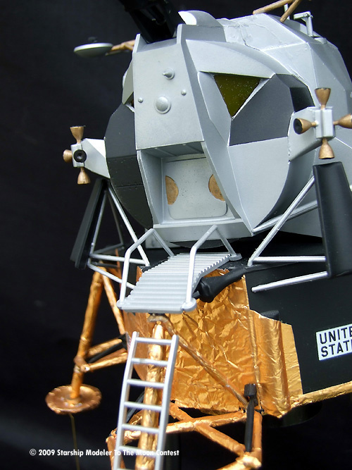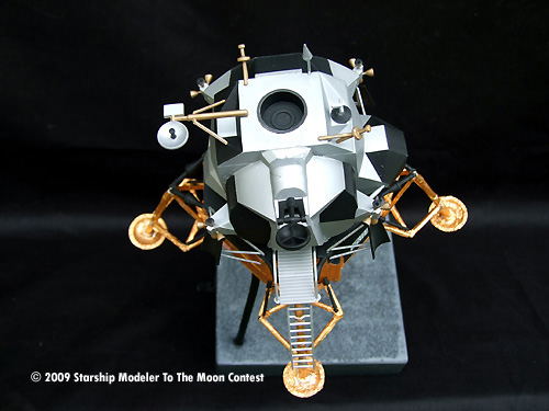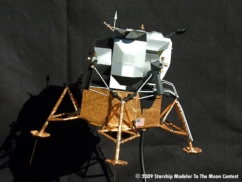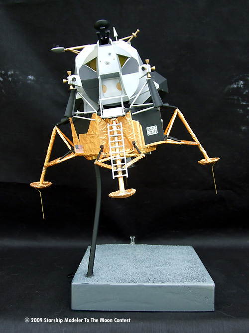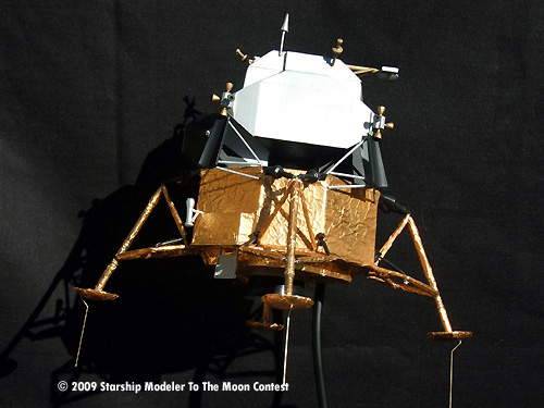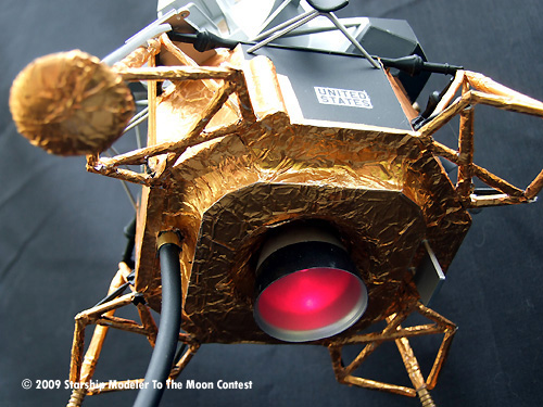 The model is the Monogram 1/48 scale Lunar Excursion Module. I built it out-of-box with the exceptions of mounting in on a support tube over a lunar surface and placing a red LED in the decent stage engine. I ran the wires down the support tube to a 9 volt battery hidden in the lunar base. The gold "Mylar" film from the kit was substituted with the gold foil from chocolate bar wrappers.