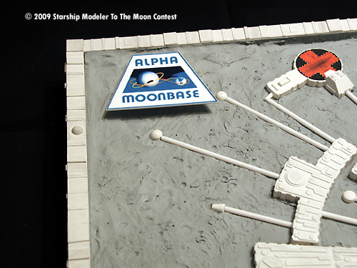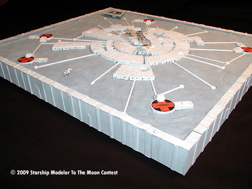 For me, the ultimate expression of man's hope to colonize the moon is Moonbase Alpha from the television series "Space: 1999". This model is a kit bash of the AMT/Ertl Moonbase Alpha kit. I decided that it would make a nice clock, so I discarded the "Main Mission" building and the awful thin, plastic lunar surface. I built a frame using 1/4" MDF and a masonite sheet. The frame detailing was done using sheet styrene in the style of the moonbase buildings. I borrowed this idea from a similar product that was once offered by Jim Small. The lunar surface was made using Bondo auto body filler. I added craters and other details with a round Dremel drill head. The Ultraprobe and Eagle clock hands are stickers courtesy of Small Art Works (EIMB). I built the missing launch pads (only 3 are provided in the kit) and added additional travel tubes and details with Evergreen styrene tubing.