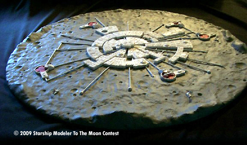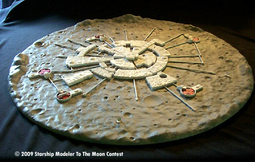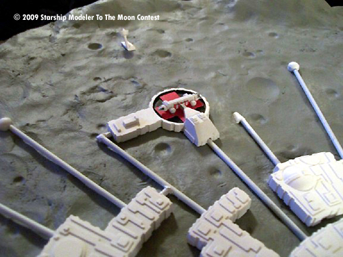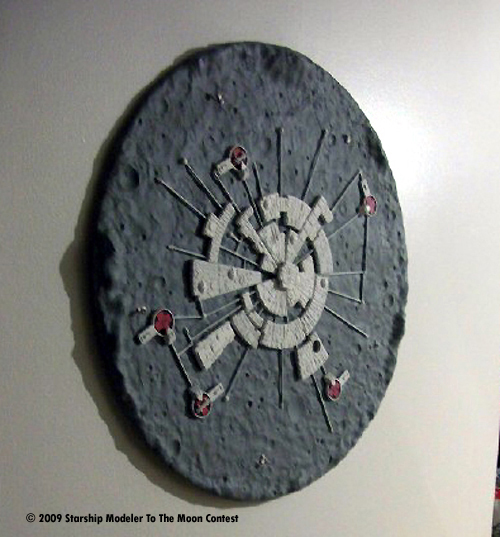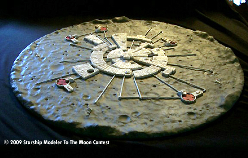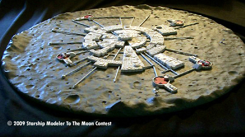For this model, I started with a 17" disk that I cut out of a 1/16" thick sheet of styrene. On that I formed the moon surface out of 2 1/2 pounds of Aves' Apoxie Sculpt, using various spheres, etc. to make the craters. I had to buy two "Alpha Moonbase" kits in order to have the correct number of Eagle landing pads, radiation domes (the travel-tube end-domes), and flammable materials bunkers (the cone shaped travel-tube ends). I corrected the shape of a few of the buildings with styrene sheet, and also scratchbuilt one small building that didn't come with the kit. I added the triangular docking area on all the Eagle landing pads. Then I cut 44 lengths of coat-hanger wire to use for the travel tubes. I didn't have any reference photos for the Laser Batteries, and I couldn't remember what they looked like, so I just made five little offset cannons tipped with the leftover radar dishes from the Nostromo model to give them a sort of "ray-gun" look. I painted the moon surface with Model Masters Neutral Gray, and the moonbase with Model Masters Flat White. Then I glued the whole thing to the moon surface with Elmer's Craft Glue. I used a map of Moonbase Alpha that I found online as a guide. There are two Eagle Transporters on their landing pads. One is a standard Eagle, and the other is a Rescue Eagle. The Rescue Eagle is on the landing pad nearest the Medical Center, and has a docking tunnel hooked up to it. There is also a hole in the back so that the whole thing can be hung on a wall.