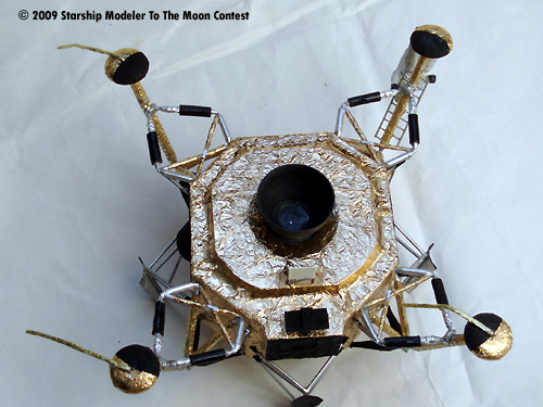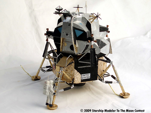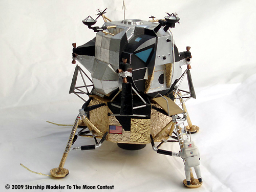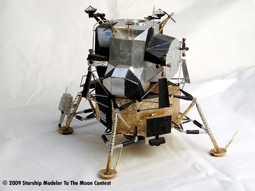 The model is of course the Apollo11 Lunar Module (LM 5). It is a scratch-build made from plastic sheet and rods, brass rods, wood, and gold and silver foil. It is made in 1/32 scale, so is about 6 inches high, and the centre's of the landing 'pads' would sit on the corners of a 6 inch square. The 1/32 figure (about to take 'one small step' is also a scratch build.
